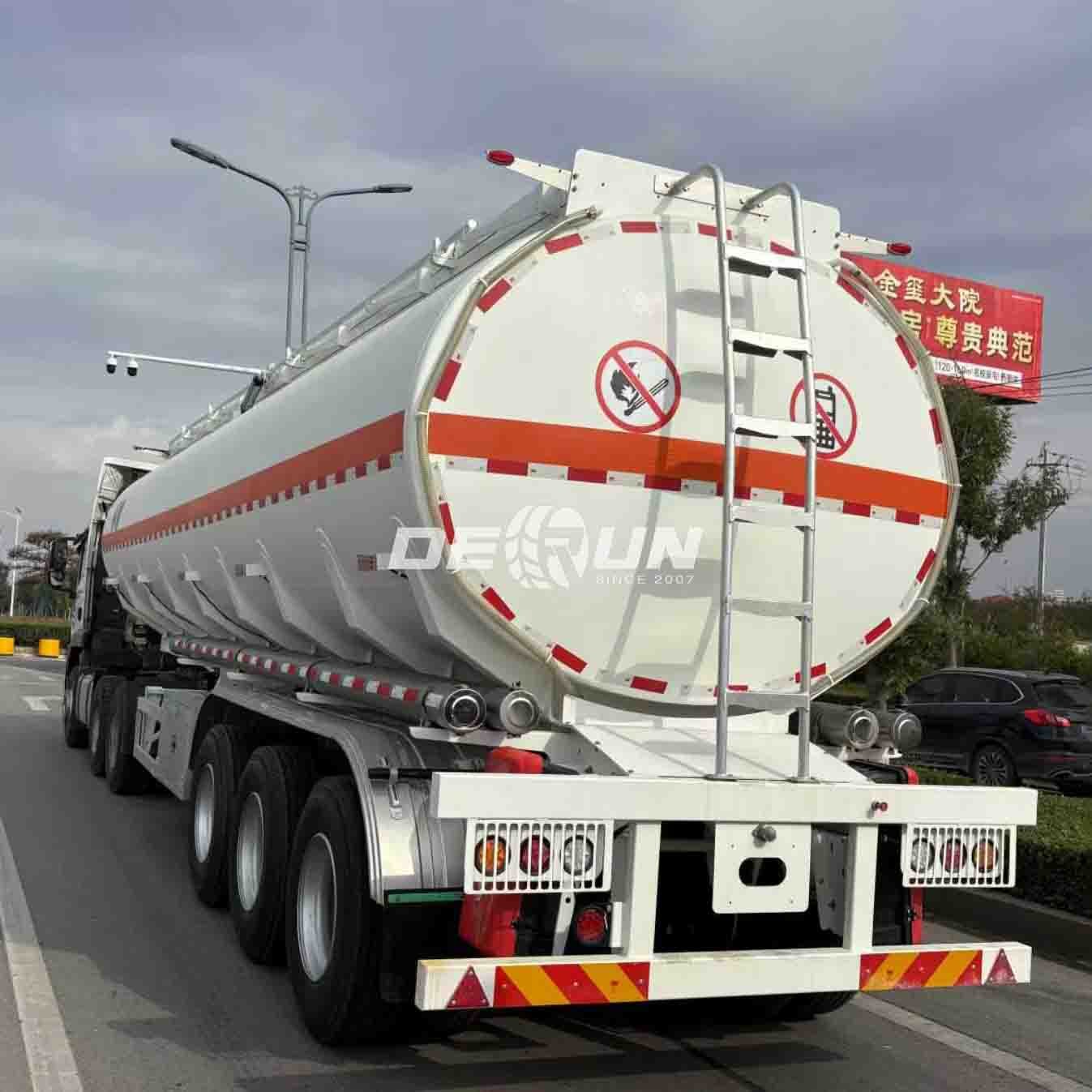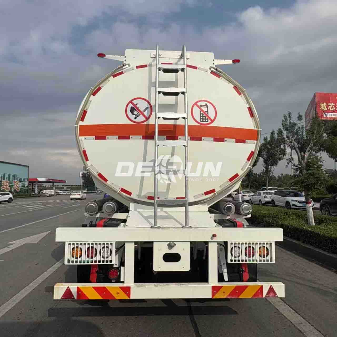 The tank body is constructed from 4mm high-quality carbon steel, with front and rear heads up to 6mm thick. Internally, it features 4mm carbon steel bulkheads and multiple wave-breaking panels, significantly reducing the impact of liquid sloshing during transport and enhancing driving stability. The tank body is welded using automatic submerged arc welding technology, resulting in smooth and tight welds. High-pressure gas leak testing ensures zero leakage, and the surface is treated with an anti-static powder coating for both corrosion resistance and durability.