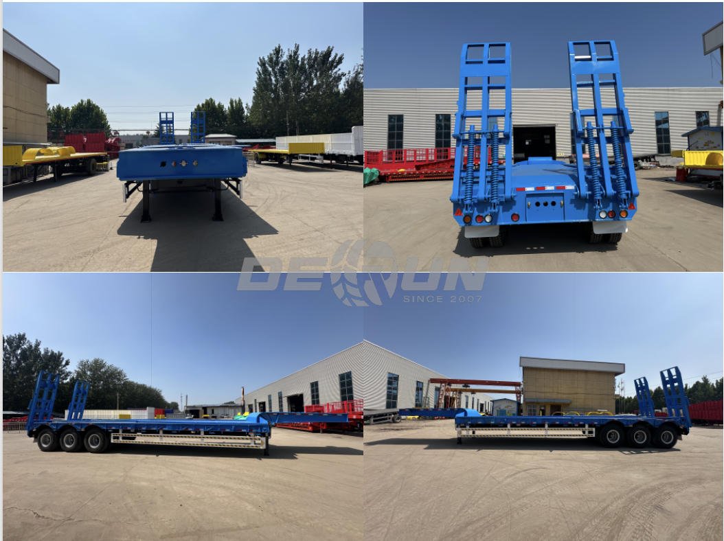The 3axle lowbed trailer utilizes a high-strength steel frame and a three-axle load-distribution design, resulting in a rated load capacity of up to 60 tons. This makes it easy to transport heavy construction machinery such as excavators and bulldozers. The low-bed structure significantly lowers the center of gravity, and the balanced load distribution of the three axles effectively reduces cargo sway and rollover risk, ensuring smooth operation even on unpaved roads. Some models offer an empty cargo area just 1.03 meters above the ground, further enhancing driving stability. The low chassis and excellent maneuverability make it suitable for both complex mine and construction site conditions in Africa and road transport. Customizable design allows the platform width to be adjusted to the size of the construction machinery, adapting to various transport scenarios. Most low-bed models feature a rear-mounted hydraulic ladder that folds flat and has a load capacity of 6-8 tons. Combined with the low-bed's height, this simplifies loading and unloading equipment such as excavators and loaders, eliminating the need for complex tools.